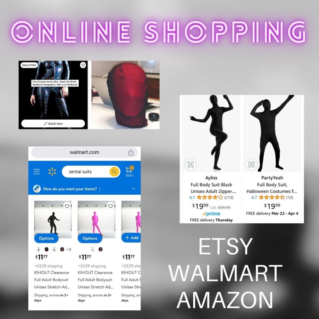 Photos below contain suggested sizing for Zentai suits as well as a few online and in-person options if you’d like to buy a suit. If you’d like to rent one from Katarina, please purchase the add-on ticket that corresponds with the suit you’d like to wear.